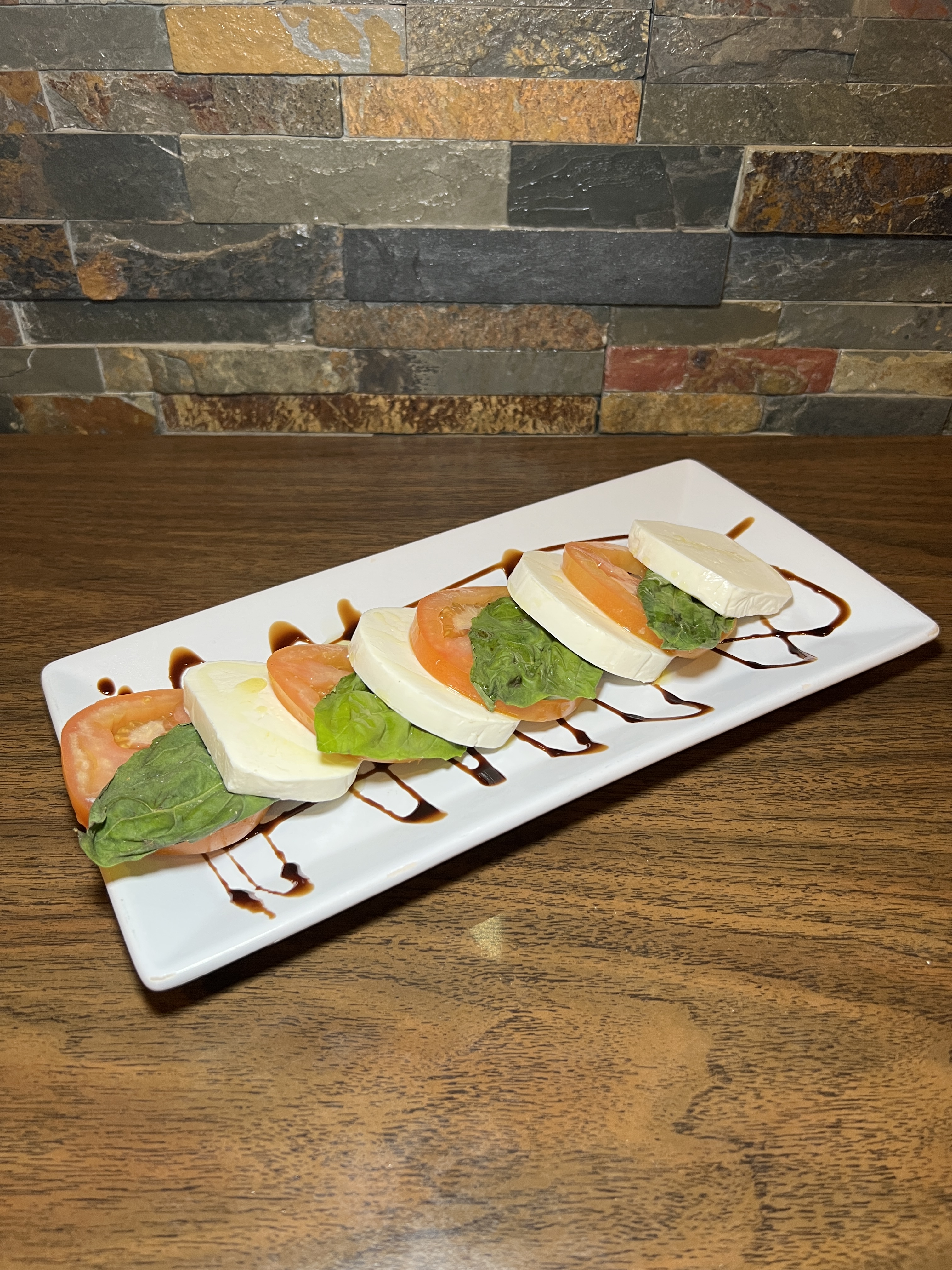Fresh buffalo mozzarella, freshly sliced tomato, and basil leaves. Served with a balsamic fig glaze and olive oil.