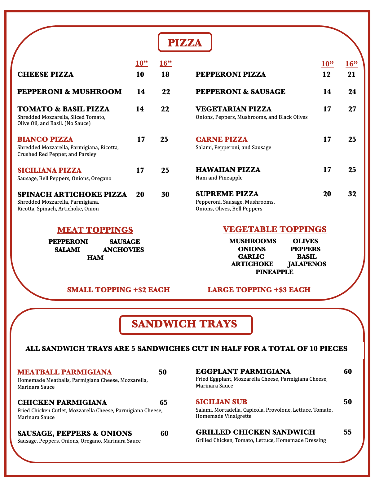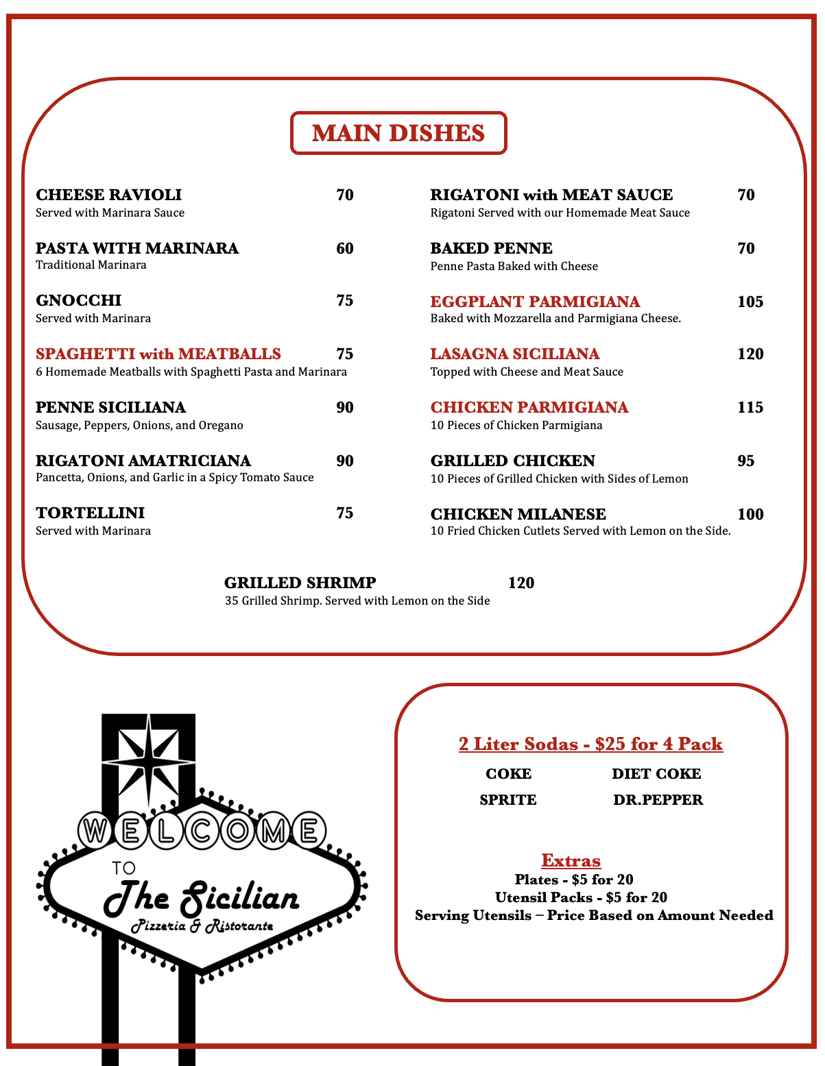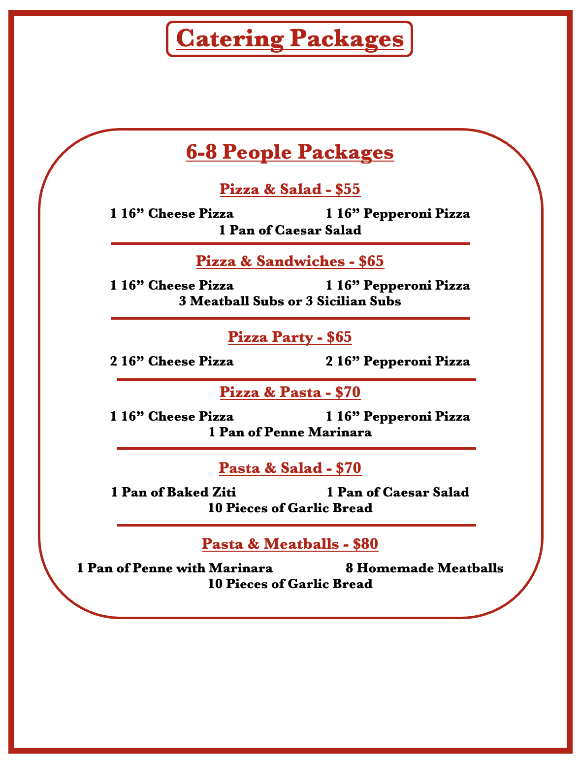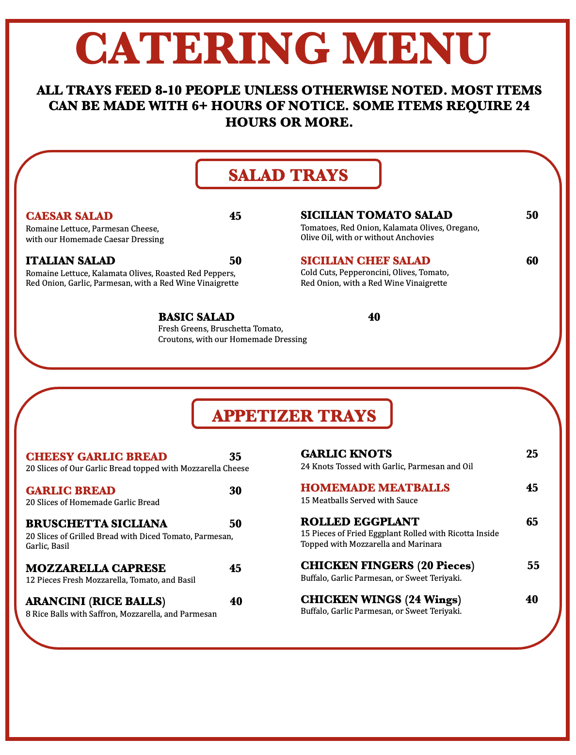 The Sicilian Pizzeria and Ristorante offers catering packages designed to bring authentic Italian flavors to your next event. Perfect for gatherings of all sizes, our catering options include packages for groups of 6-8 people, 8-12 people, and 15-20 people, making it easy to feed your guests without the stress of cooking. Each package features a selection of our most popular dishes, from pastas and pizzas to fresh salads and more, ensuring there’s something for everyone to enjoy. Let us take care of the food while you focus on making memories. For more information or to place your order, call us at 702-458-2004 or email SicilianRistorante@gmail.com.
