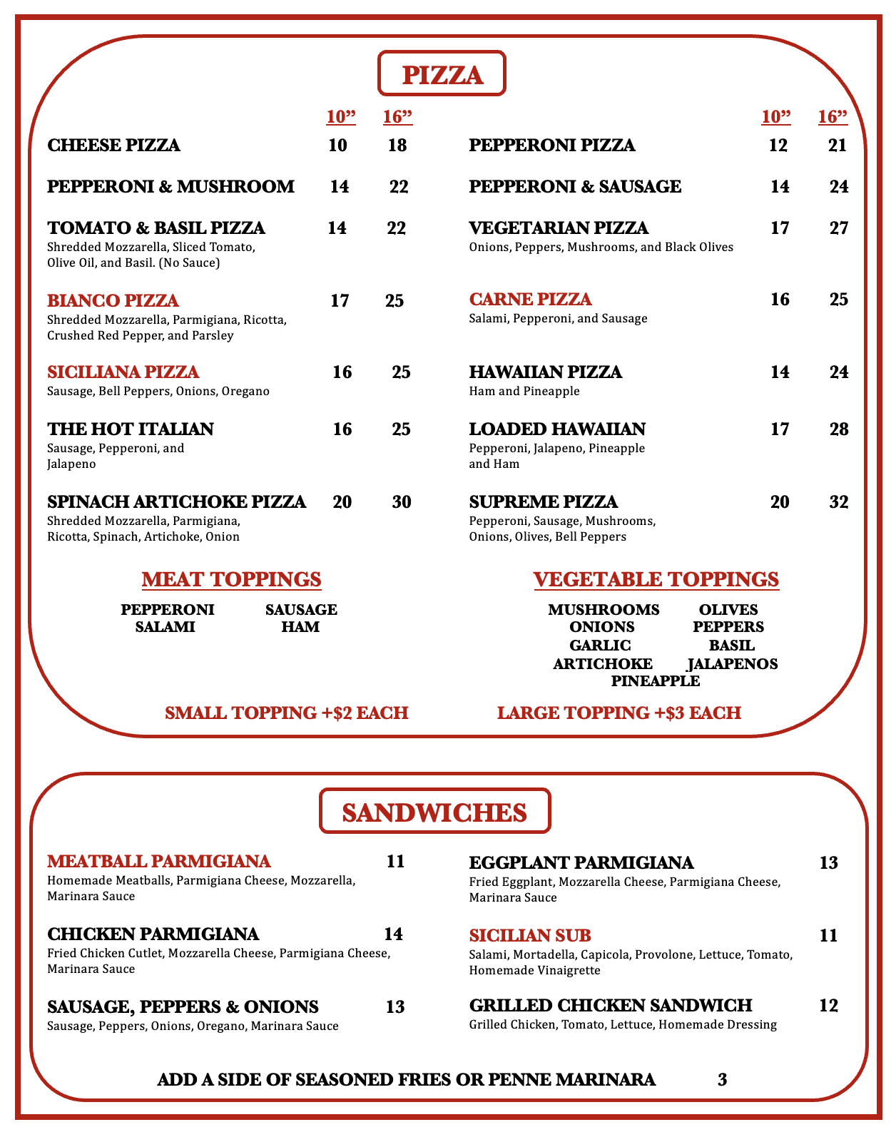 Our Menu is served all day and features many favorites like Chicken Parmigiana, Lasagna, Mozzarella Sticks, and of course our delicious pizza.