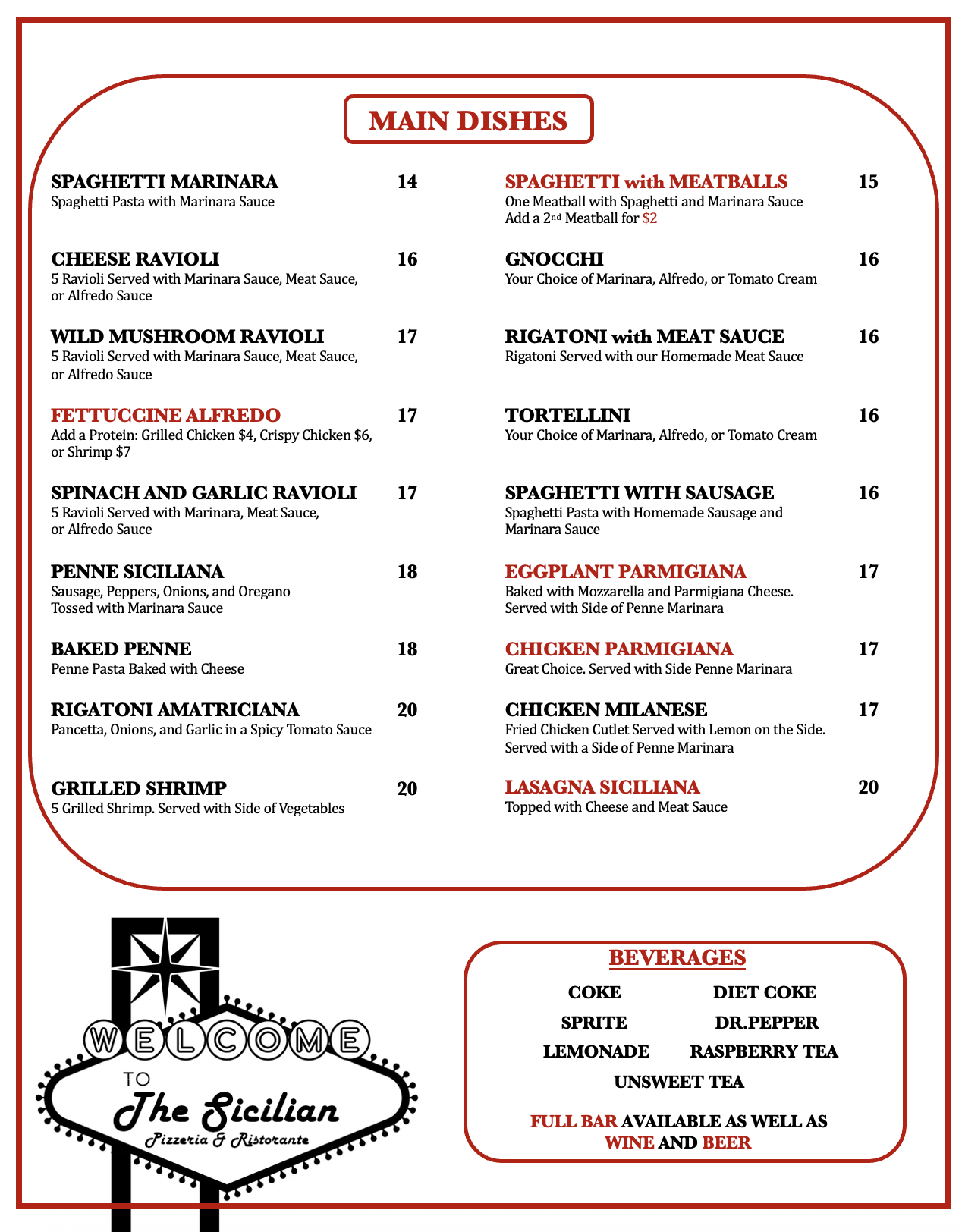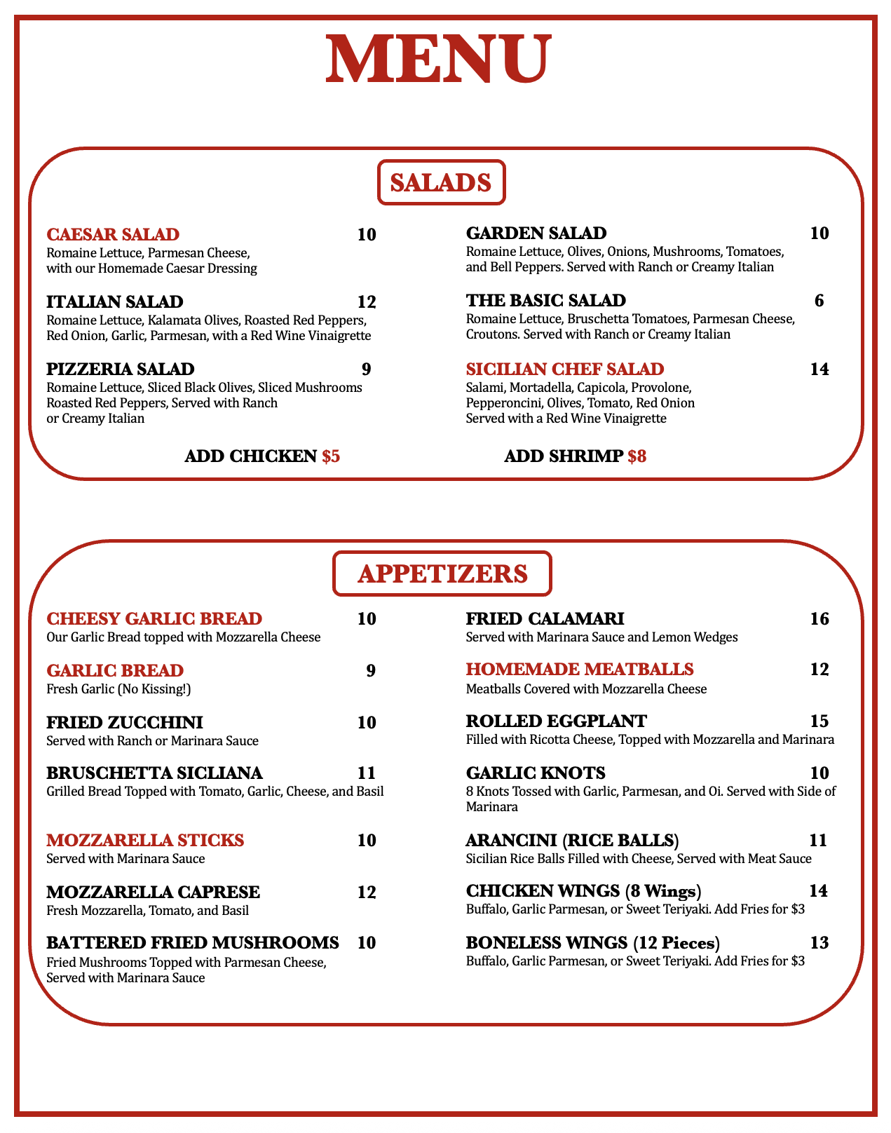 Our Pizza is served in either 10″ or 16″ sizes. We use dough made in-house using a special recipe that has been crafted to provide the perfect pizza time after time. We use freshly shredded mozzarella cheese and our secret pizza sauce recipe to ensure the flavor of each pizza will blow you away. Be sure to checkout our specialty pizzas for a treat you can only get at The Sicilian Pizzeria & Ristorante.