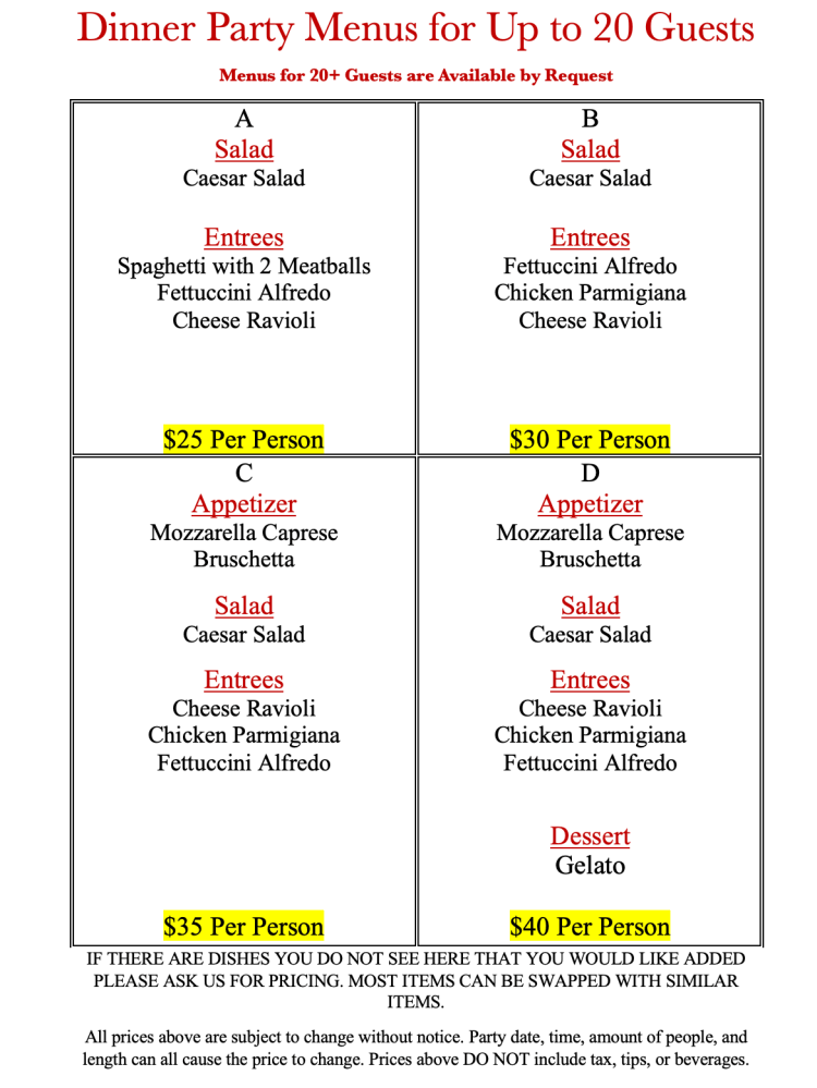 If you’re looking to host a party or event in a cozy and welcoming atmosphere, The Sicilian might just be the perfect place for you. We offer a party room that can comfortably hold up to 30 guests, making it ideal for gatherings or celebrations. The party packages start at $20 per head, which includes a choice of one of four entrees and either a house or Caesar salad. The Sicilian also offers a variety of drink options to complement your meal. With its delicious food, inviting ambiance, and attentive service, renting a room for parties at The Sicilian is sure to be a memorable experience for you and your guests. For more information please fill out the form below and someone will reach out to you with more information.